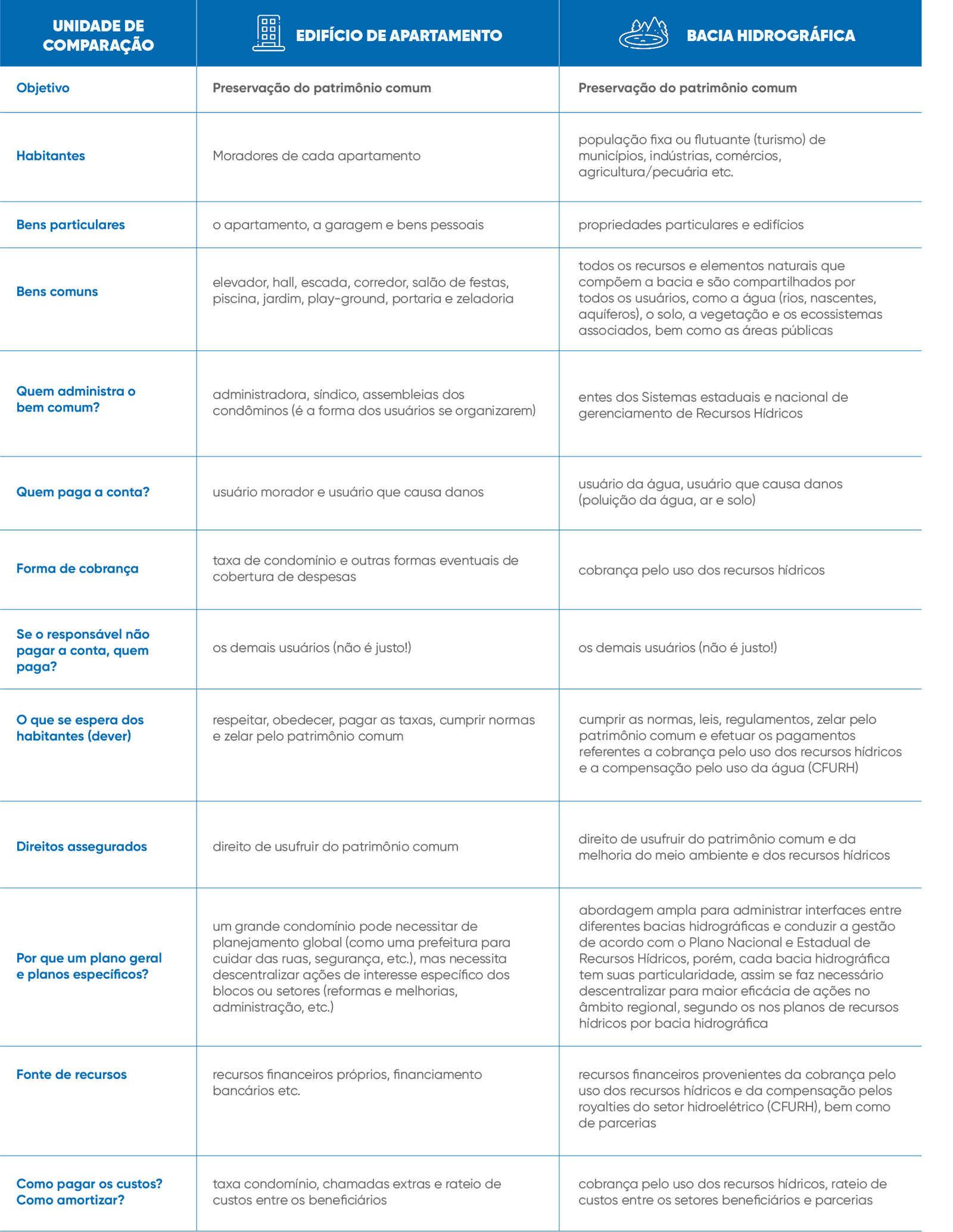 A cobrança pelo uso de recursos hídricos se difere da tarifa cobrada dos consumidores pelo tratamento e distribuição de água para abastecimento público, uma vez que esta é cobrada pelo ente local, o operador de saneamento. Também não é um imposto, e sim, uma remuneração pelo uso de um bem público, cujo preço é fixado a partir da participação dos usuários da água, da sociedade civil e do poder público, no âmbito de Comitês de Bacias Hidrográficas.