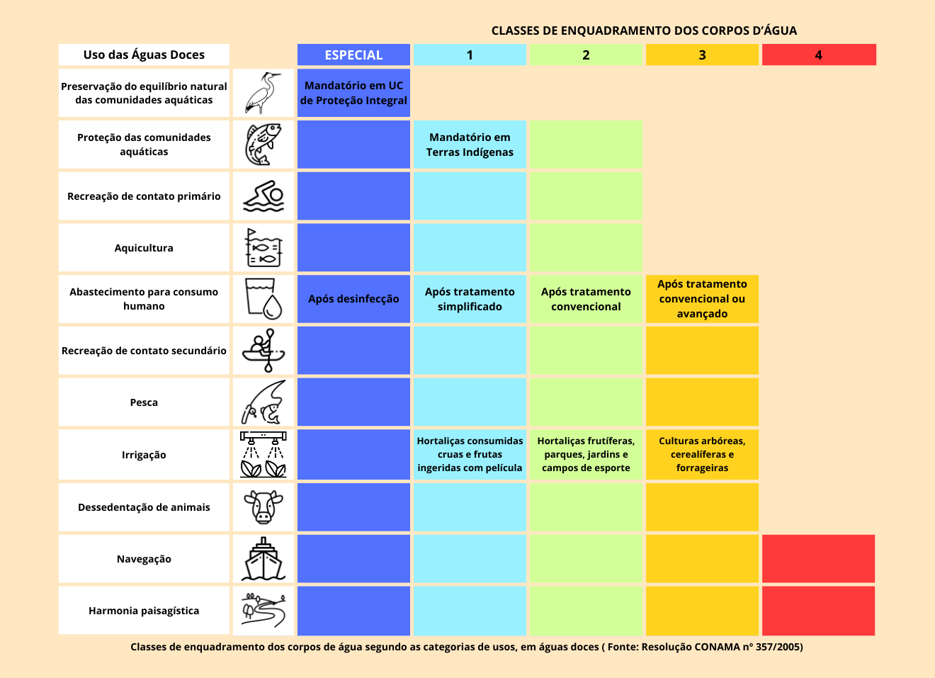 De acordo com a Resolução CONAMA 357/2005, a qual define as classes de água para corpos de água superficiais, o enquadramento dos corpos hídricos é o estabelecimento da meta ou objetivo de qualidade da água (classe) a ser, obrigatoriamente, alcançado ou mantido em um segmento de corpo de água, de acordo com os usos preponderantes pretendidos, ao longo do tempo.