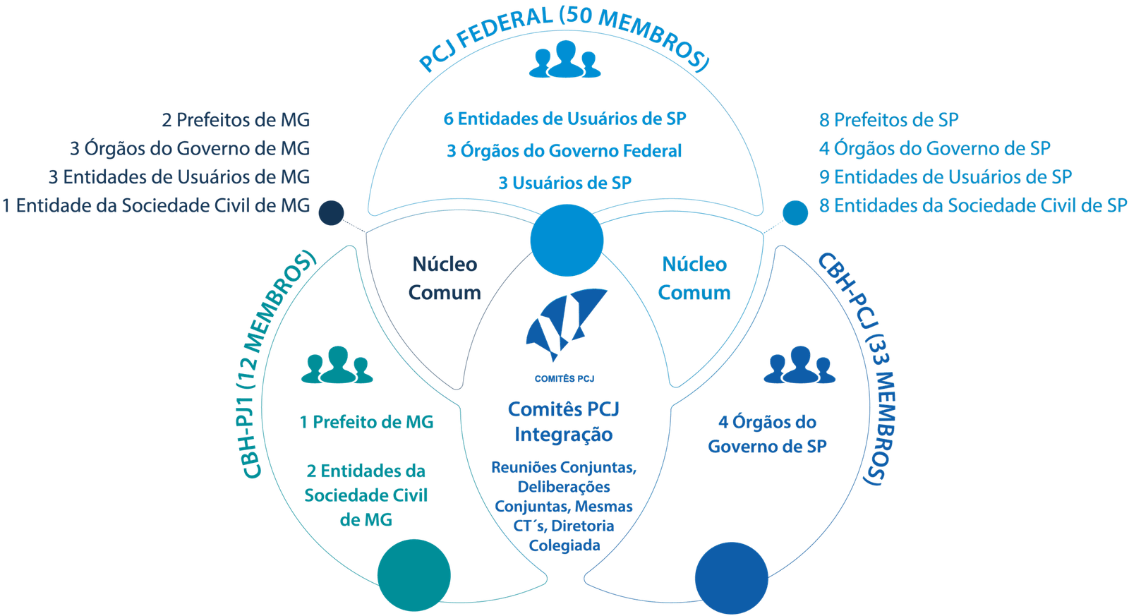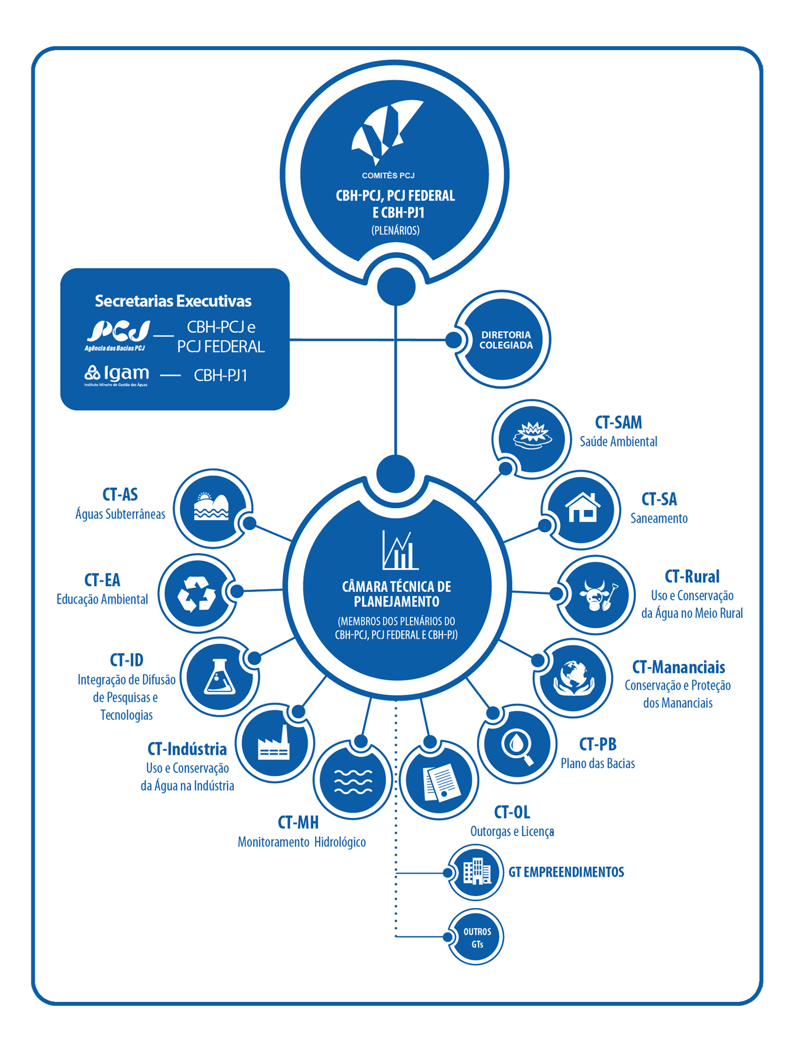 Os Comitês PCJ atuam como colegiados integrados, com funções deliberativas e consultivas, compostos por três Plenários (paulista, mineiro e federal), Diretoria Colegiada, Secretaria Executiva e 12 Câmaras Técnicas (CTs). Estas câmaras podem contar com Grupos de Trabalho voltados a discussões específicas, cujos representantes das entidades participantes fornecem subsídios técnicos e estratégicos para as decisões dos Plenários. O conjunto dessa estrutura tem como propósito promover debates, definir metas e alocar recursos financeiros para otimizar o gerenciamento dos recursos hídricos nas Bacias PCJ. Essa integração é fundamental para assegurar a coerência nas ações e estratégias relacionadas à gestão dos recursos hídricos nas Bacias PCJ.