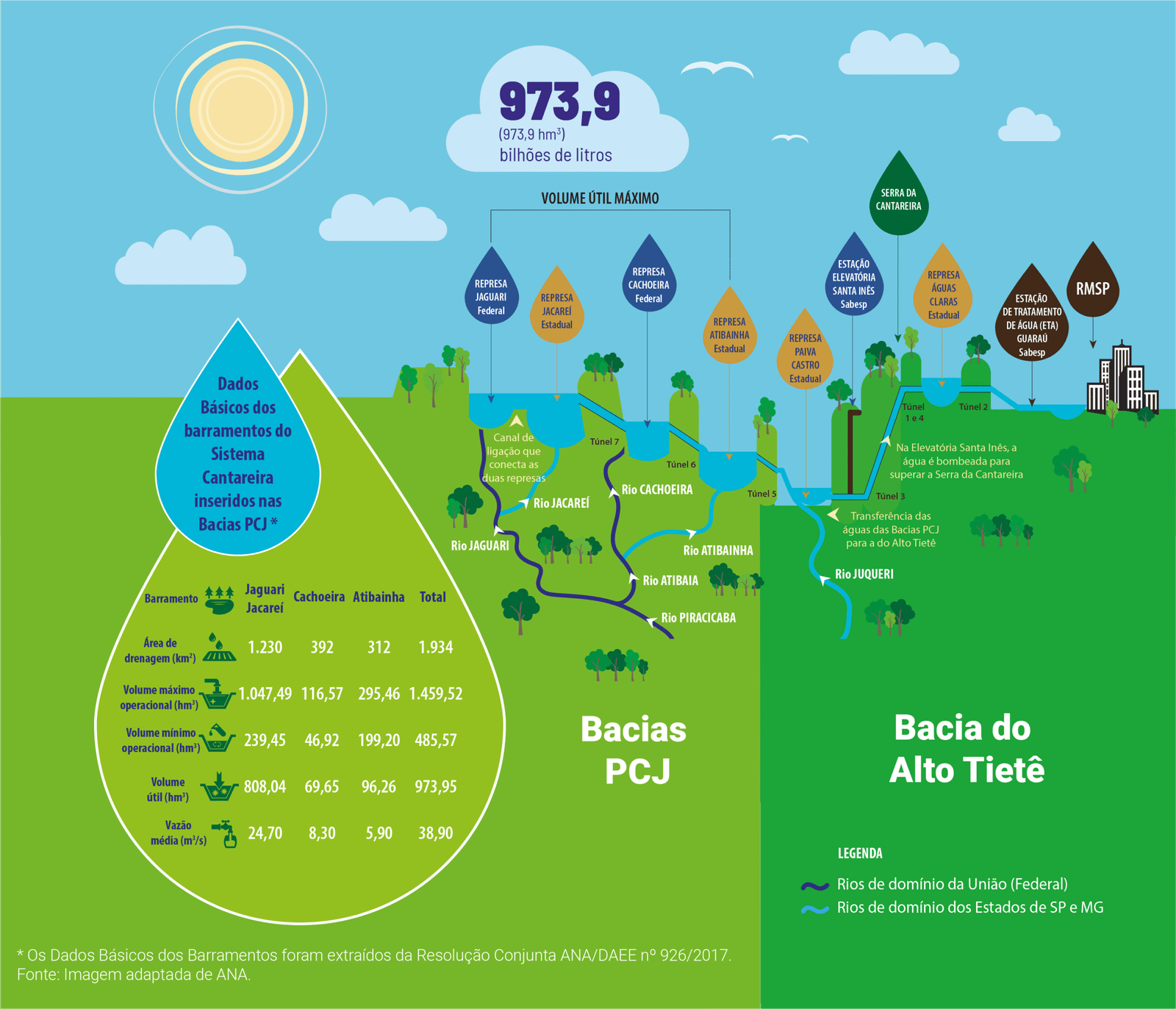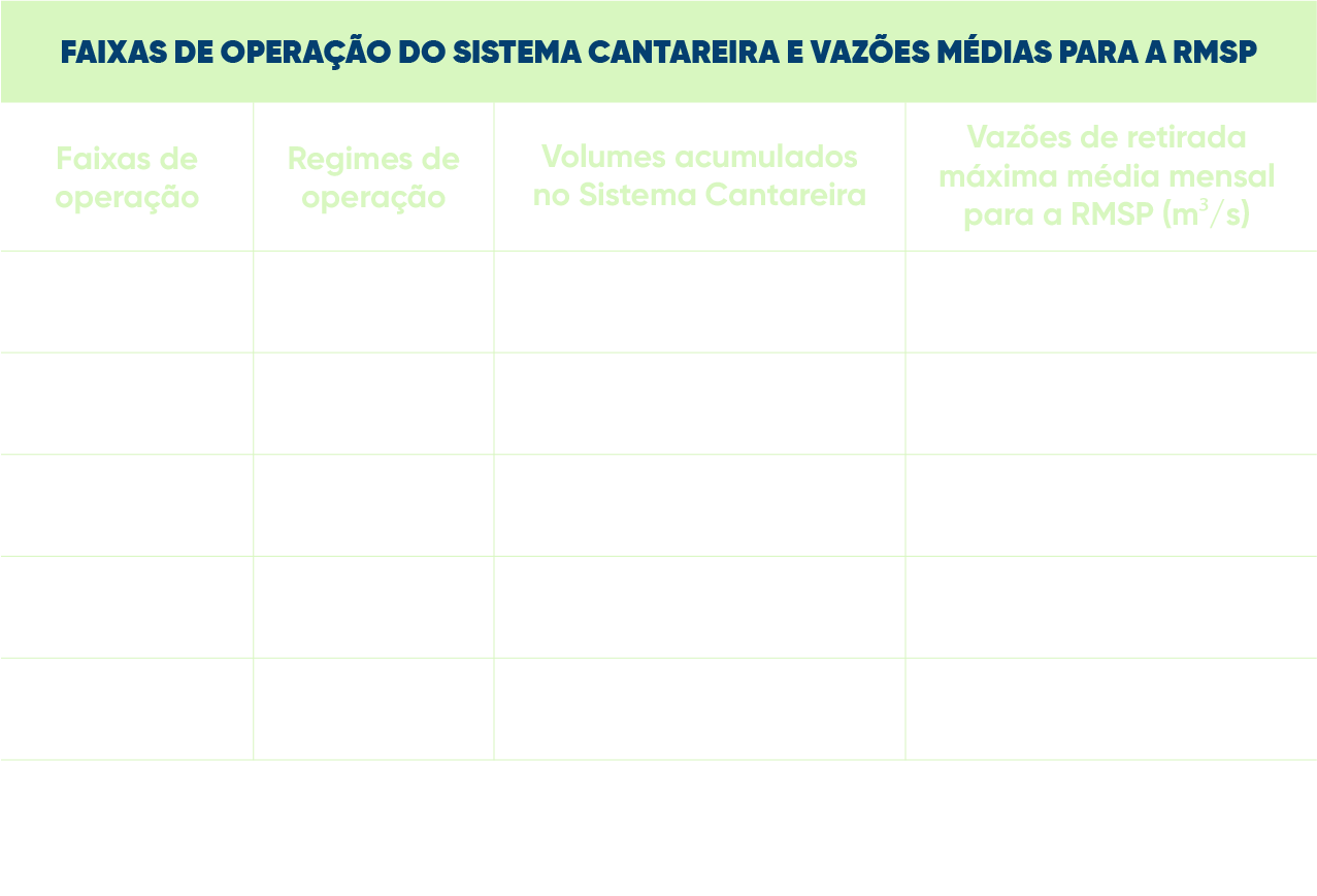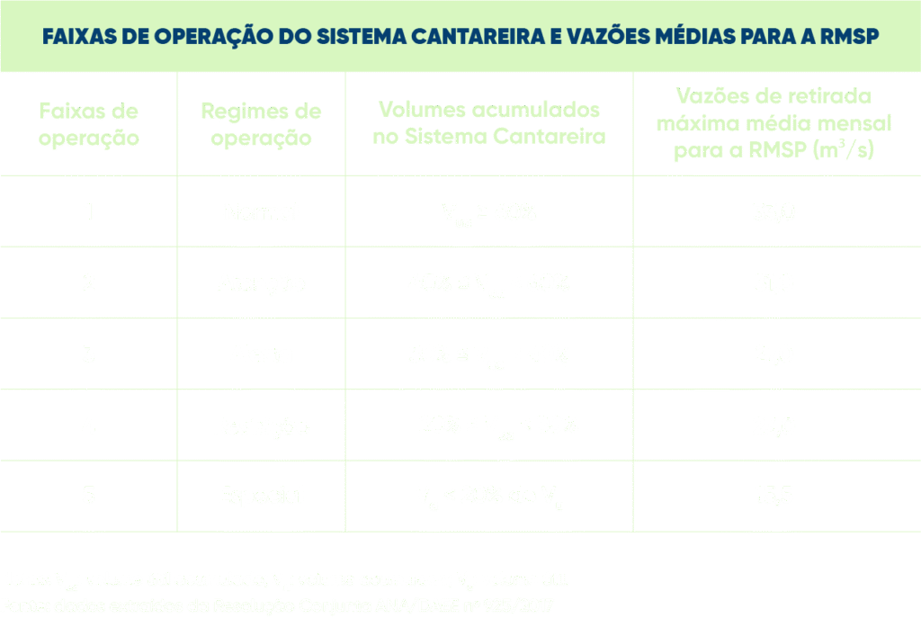 Para a RMSP, o controle da captação de água do Sistema Cantareira, realizada pela SABESP, é a vazão média captada na Estação Elevatória Santa Inês, autorizada mensalmente de acordo com as faixas de volume acumulado no referido sistema. Essas faixas de operação são estabelecidas conforme o quadro ao lado.