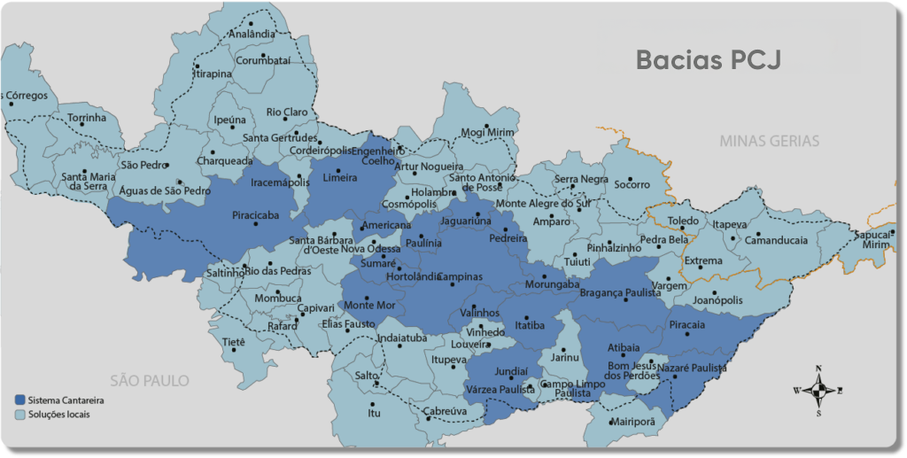 Nas Bacias PCJ, costuma-se considerar as 19 cidades paulistas cujo abastecimento hídrico é diretamente influenciado pelas descargas de água do Sistema Cantareira. São elas: Americana, Atibaia, Bom Jesus dos Perdões, Bragança Paulista, Campinas, Hortolândia, Jaguariúna, Jundiaí, Itatiba, Limeira, Monte Mor, Morungaba, Nazaré Paulista, Paulínia, Pedreira, Piracaia, Piracicaba, Sumaré e Valinhos. Além disso, há dezenas de municípios que não dependem diretamente das calhas dos rios influenciadas pelo Sistema Cantareira para abastecimento e, portanto, utilizam outros mananciais.
