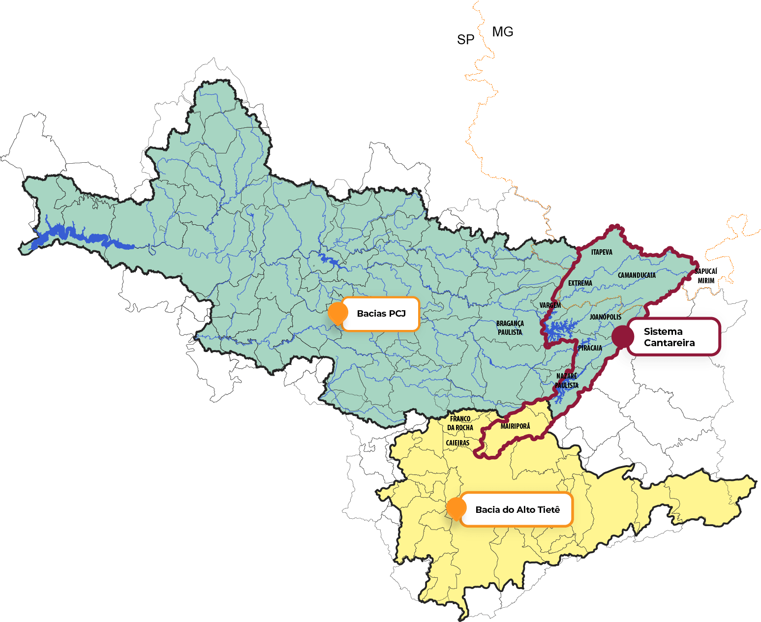 Atendendo cerca de 9 milhões de habitantes localizados nas Bacias PCJ e na Região Metropolitana de São Paulo (RMSP). O Sistema Cantareira é formado por 6 reservatórios conectados entre si por meio de túneis subterrâneos e canais. Os quatro maiores reservatórios (Jaguari, Jacareí, Cachoeira e Atibainha, localizados nas Bacias PCJ) estão localizados nas Bacias PCJ, cujas águas são direcionadas para a Bacia do Alto Tietê, abastecendo os reservatórios de Paiva Castro e Águas Claras seguindo para Estação de Tratamento de Água Guaraú (ETA Guaraú).